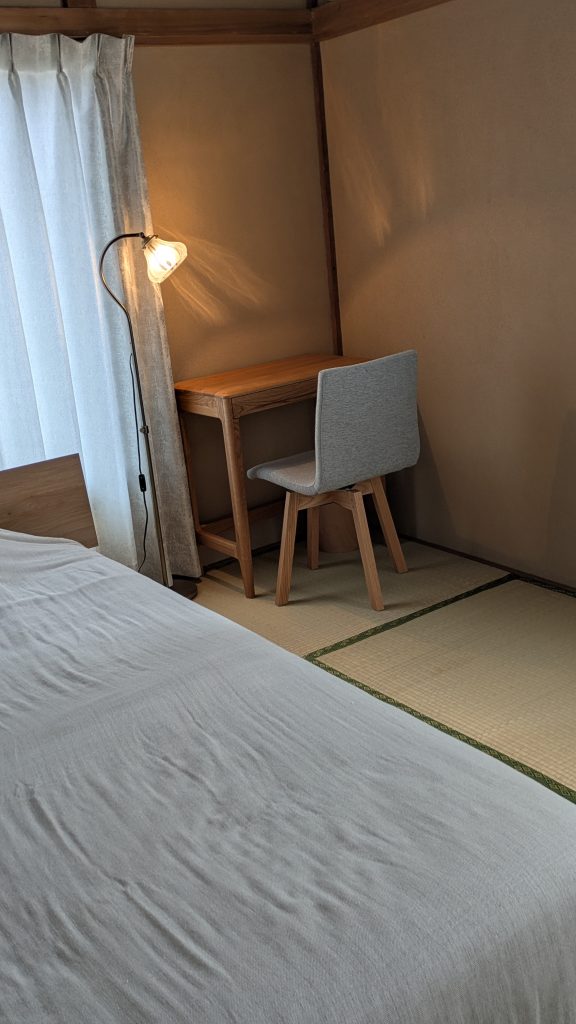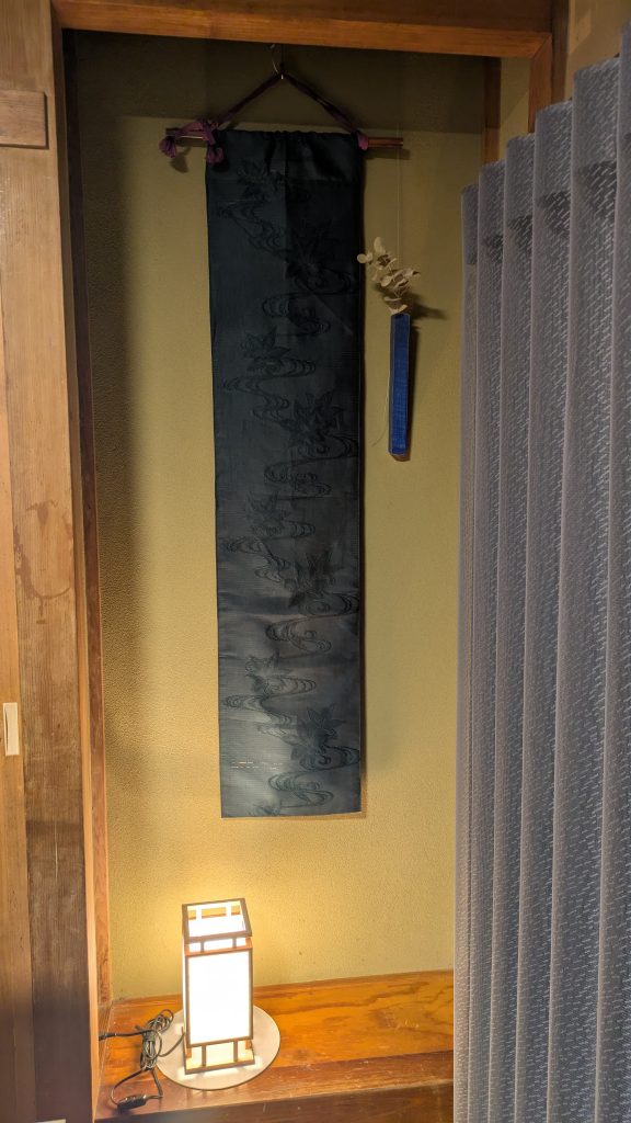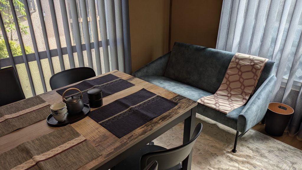 A kimono obi and a washi paper lamp were used to add a subtle Japanese touch.